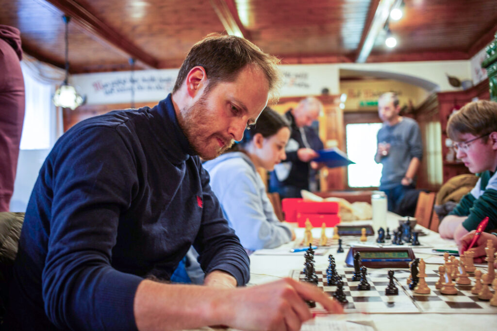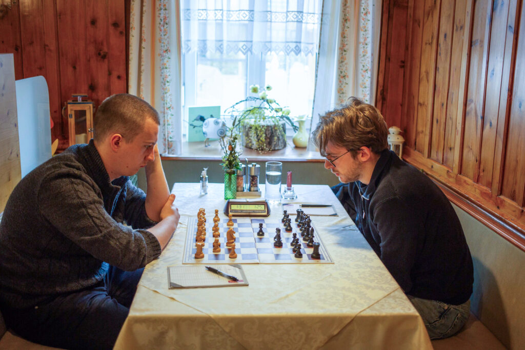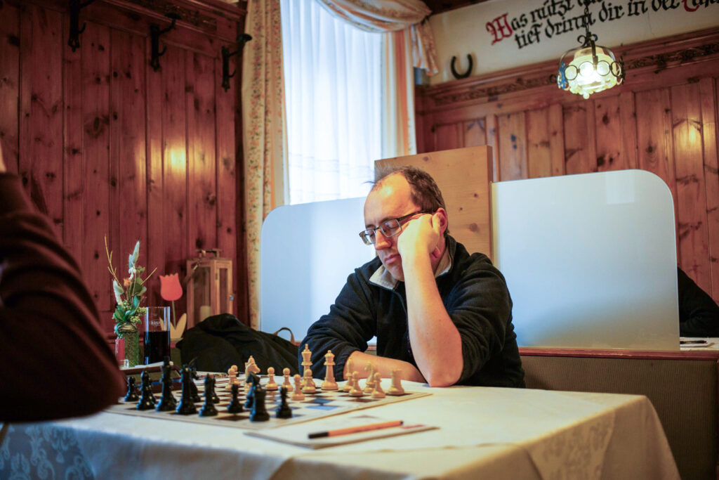 Große Erleichterung, als in einer sehr unklaren Stellung eine Bauerngabel auf Brett sechs Robert den ganzen Punkt einbrachte. Ein enorm wichtiger Punkt, der uns die Führung bescherte. Oliver auf Brett 7 und Lena am Jugendbrett remisierten ihre Partien, somit mussten die zwei weiterhin laufenden Begegnungen über den Matchausgang entscheiden. Am Spitzenbrett verwaltete IM Lukas Leisch ein schwieriges Endspiel sehr umsichtig und neutralisierte das gegnerische Läuferpaar mit einer starken Verteidigungsleistung. Remis! Und damit war zumindest der unentschiedene Wettkampfausgang gesichert.